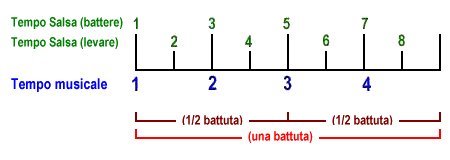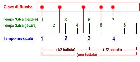 La prima misura sincopata, considerata forte, è sempre contrapposta a quella successiva, lineare o debole, ed il loro accoppiamento crea un continuo alternarsi di tensione e di rilassamento ritmico della musica. Ascoltando un brano di salsa possiamo seguire la melodia contando gli otto tempi: 1-2-3-4-5-6-7-8 etc., oppure la ritmica scandendo la clave PA---PA---PA----PA-PA. Alla fine del giro ci troveremo di nuovo sull’uno musicale, pronti a ricontare l’uno o a ricantare il primo colpo di clave. Il ritmo è scandito dalla sezione percussiva dell’orchestra, ciascuna percussione esegue un suo peculiare pattern ritmico, che però è capeggiato, diretto e legato indissolubilmente alla clave. Tant’è che quando la clave è sottintesa o coperta dal suono degli altri strumenti, si può facilmente desumere dal suono delle altre percussioni.